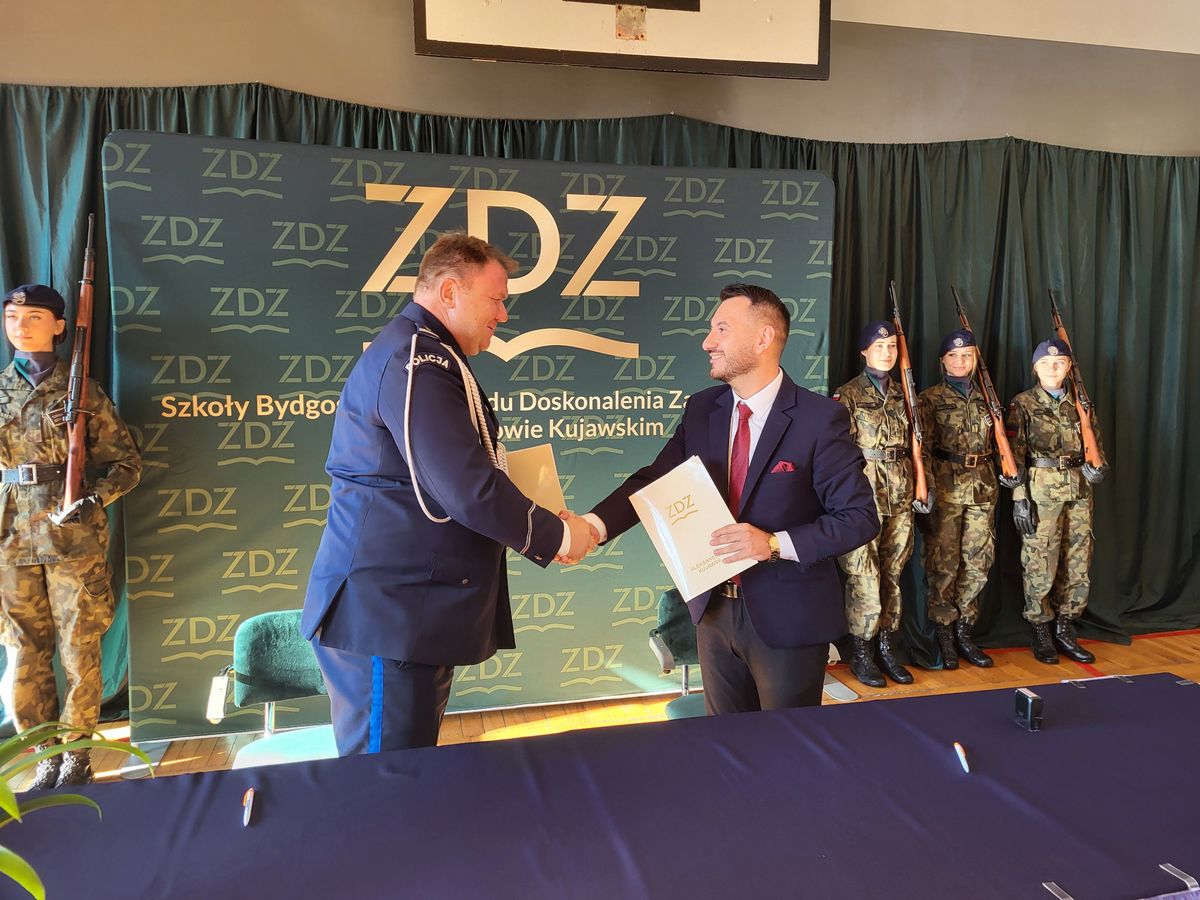 Komendant Powiatowy Policji w Aleksandrowie Kujawskim inspektor Radosław Tuszyński pogratulował pierwszoklasistom wyboru ścieżki policyjnej i życzył samych sukcesów w nadchodzącym roku szkolnym.