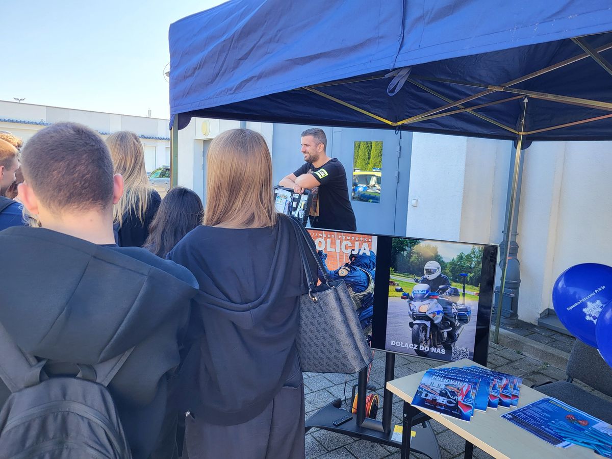 Przyszli kandydaci mieli również okazję zobaczyć, jak policyjny przewodnik pracuje ze swoim psem. Instruktor strzelectwa prezentował i tłumaczył zasady działania jednostek broni używanych w Policji.