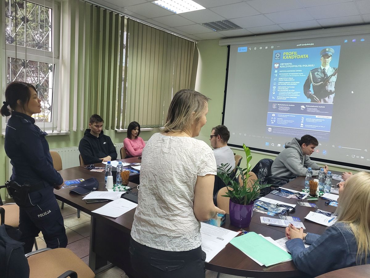 Uczestnicy spotkania dowiedzieli się nie tylko, jak wygląda procedura doboru do służby, ale także na czym polega praca w Policji. Dodatkowo omówili, jak wygląda ścieżka kariery zawodowej policjanta, a także jego uposażenie i inne finansowe oraz emerytalne aspekty wpływające na decyzję o wyborze zawodu.