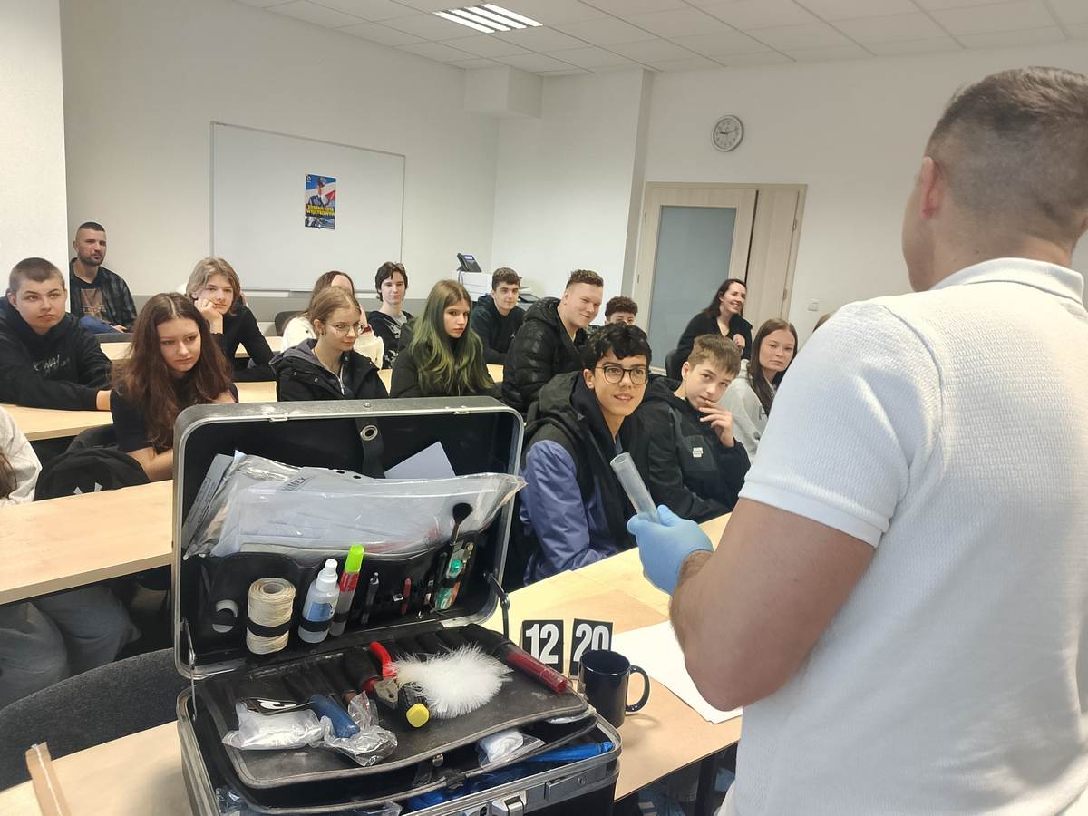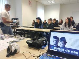 Podczas wizyty uczniowie zapoznali się z etapami postępowania kwalifikacyjnego do służby w Policji. Mieli także możliwość dowiedzieć się na czym polega praca policjantów w poszczególnych wydziałach. O swojej pracy opowiedział technik kryminalistyki oraz przewodnik psa.
